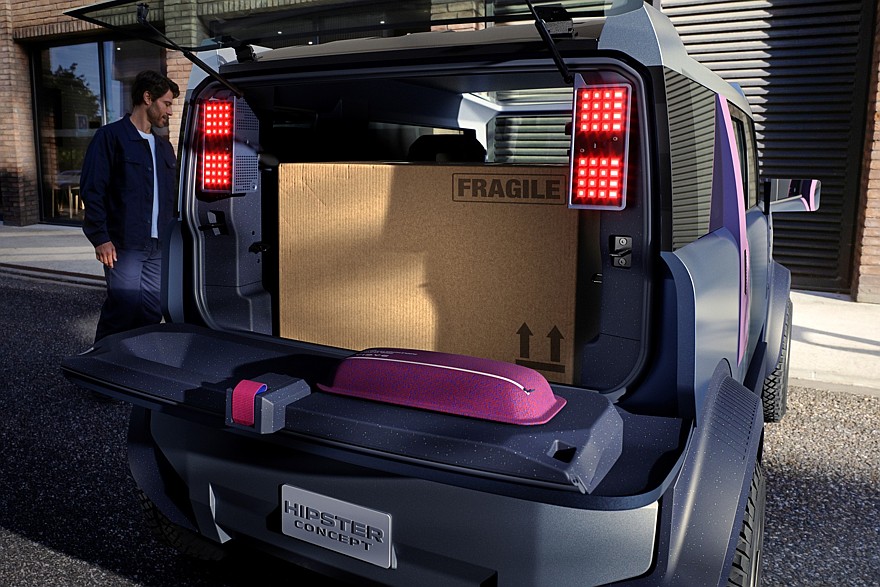 Габаритная длина Dacia Hipster составляет всего 3 м, ширина — 1,55 м, высота — 1,53 м. Дизайн можете оценить по фотографиям и рендерам: Hipster — это кирпичик с расставленными по углам колёсами и плоскими стёклами. Ради максимального удешевления конструкции у боковых дверей нет стеклоподъёмников — вместо них установлены сдвижные форточки, а задние светодиодные фонари не имеют собственных защитных корпусов и прячутся под стеклом верхней секции багажной двери. Весит Hipster менее 800 кг.