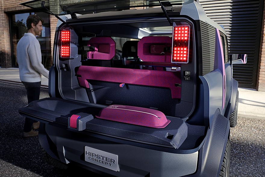 Узенький салон Hipster рассчитан максимум на четверых, спинки и подушки представляют собой конструкцию, напоминающую гамак — трубчатый каркас и натянутая на него ткань. Задние подголовники крепятся к задним стойкам кузова для удобства увеличения скромного багажника: если сложить задний диван, то объём багажника вырастет с 70 до 500 л.