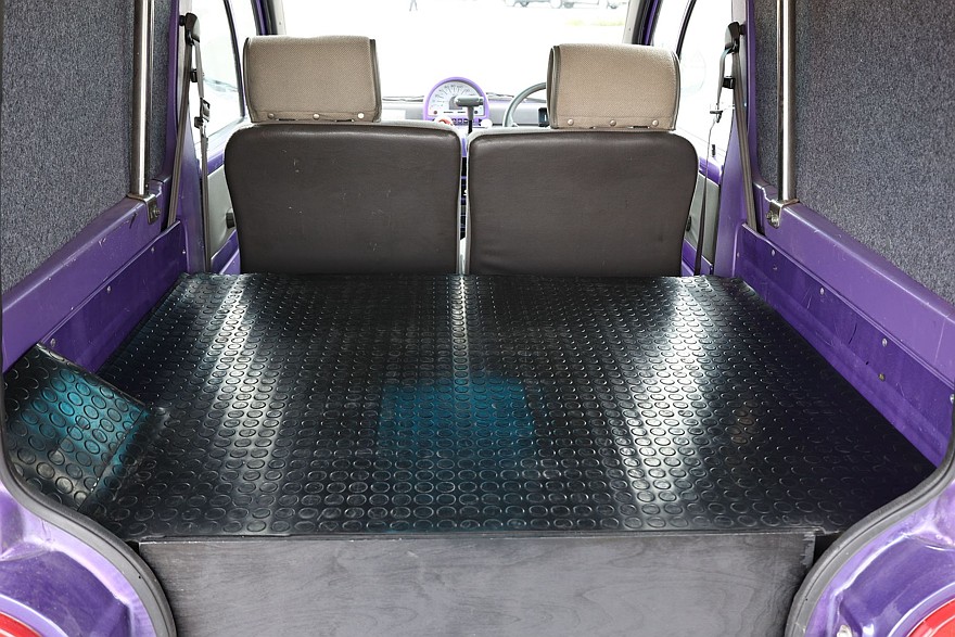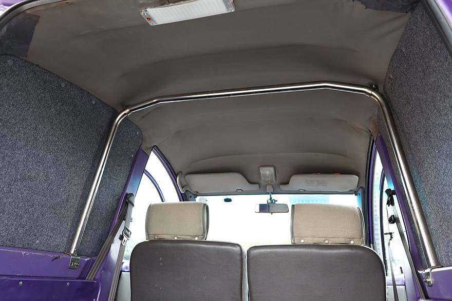 Просторный грузовой отсек не отделен от кабины, крышу усиливает дуга безопасности. Правда, в этом экземпляре еще сохранилось наследие прежних коммерческих владельцев: пол грузового отсека зачем-то завышен кустарно изготовленной «палубой». Возможно, для облегчения погрузки поддона – чтобы его не пришлось приподнимать над сужением дверного проема, образованного выступами задних фонарей. И еще удален второй ряд сидений. Да-да, вы не ослышались: у S-Cargo было два ряда сидений! За передними креслами штатно располагался складной второй ряд в виде крошечной и узенькой лавочки.