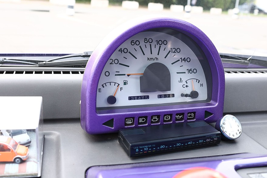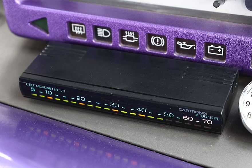 Штатный тахометр в машине не предусмотрен, так что его роль выполняет установленный позже электронный индикатор оборотов в виде лежащего под приборкой плоского блока размером с видеокассету VHS. Шкала оборотов на нем – линейная, из дискретных светодиодов.