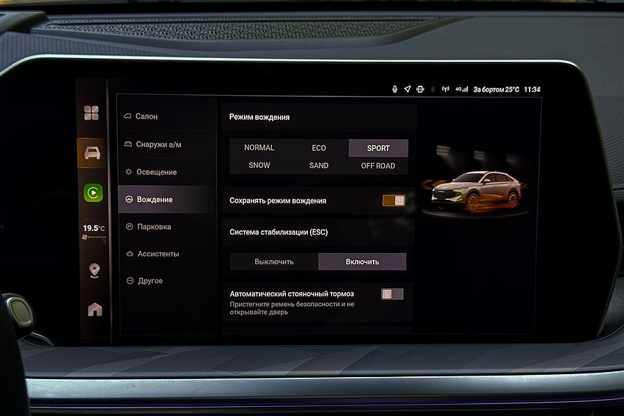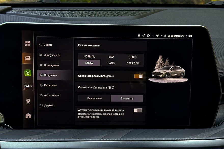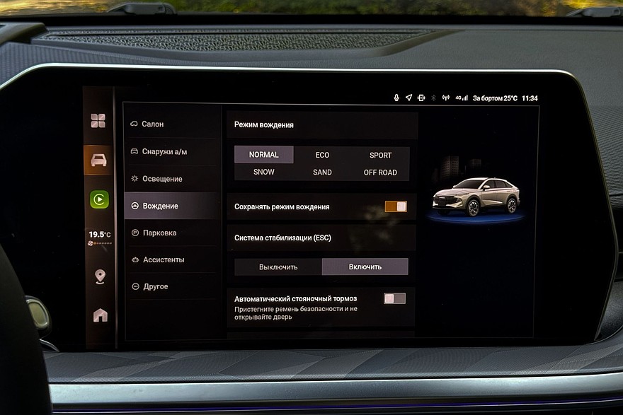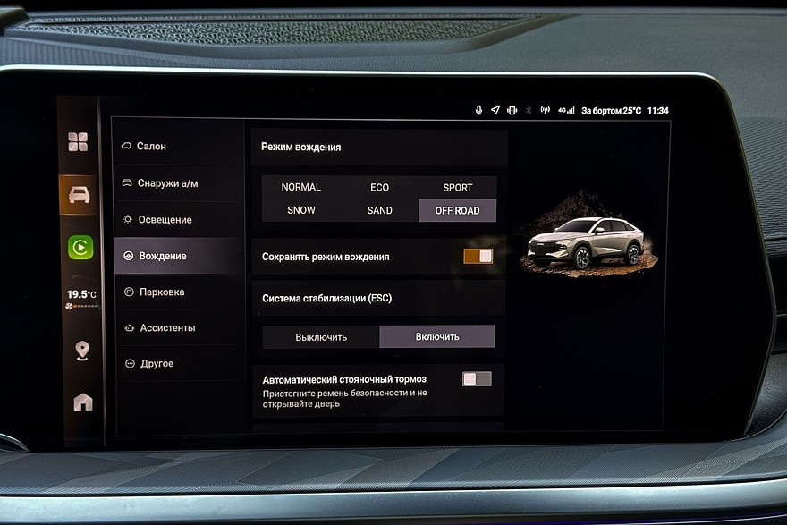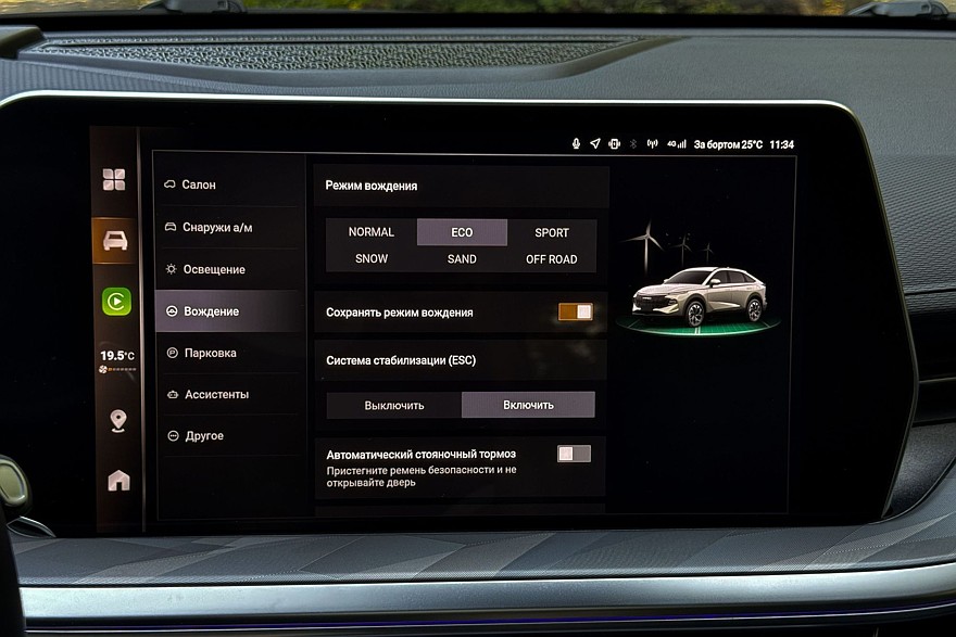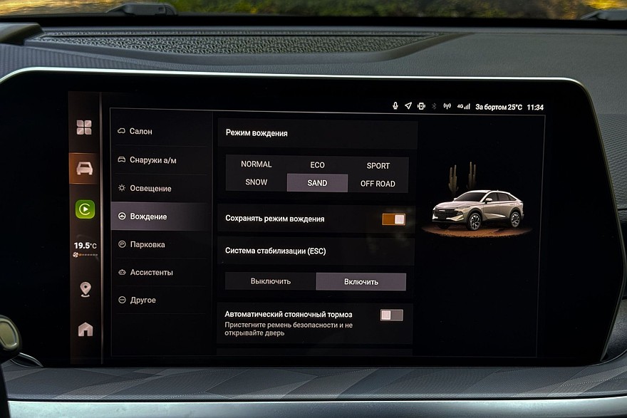 Кроссовер предлагает на выбор шесть режимов движения: Normal, Eco, Sport, Snow, Sand и Off Road. Первый из них – действительно «нормальный», это своего рода дефолтные настройки. «Эко» делает силовой агрегат ленивым, спортивный – обостряет реакции на педаль газа и держит обороты выше. «Снежный» отличается от «Песочного» тонкими настройками. В Snow кроссовер избегает пробуксовки и при распределении момента отдаёт приоритет передней оси, в Sand педаль газа более отзывчива, а тяга делится между осями примерно пополам.