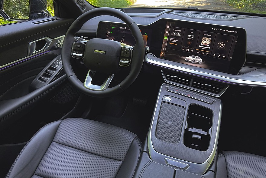 А вот интерьер F7x может быть «любого цвета при условии, что он чёрный». Выбора нет, а жаль. У кросс-купе, как ни странно, другой руль, знакомый нам, к примеру, по другой «семёрке» Haval – с буквой H. Здесь же он смотрится весьма чужеродно, и изящное рулевое колесо с круглой ступицей от обычного F7 было бы намного уместнее. Зато у водительского кресла появилась регулировка по углу наклона подушки – вещь полезная, особенно с учётом того, что подушка традиционно коротковата.
