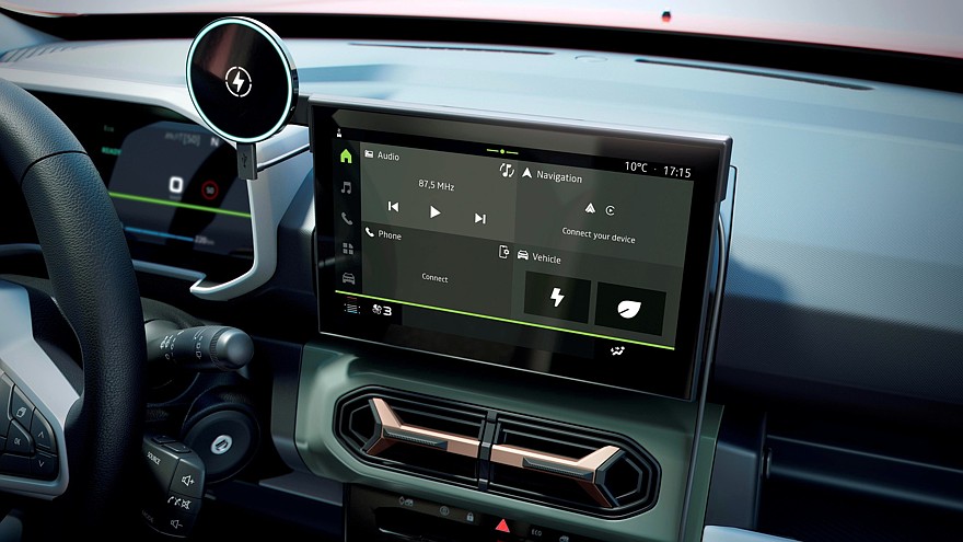 Существенных визуальных обновок у Dacia Spring нет, то есть выглядит он, в сущности, так же, как после рестайлинга 2024, несмотря на аэродинамические обновки. В базовой комплектации Essential по-прежнему нет кондиционера и мультимедийного экрана, но есть три точки для установки фирменного крепления YouClip, которое позволяет удобно разместить в передней части салона тканевую сумку, держатель для смартфона со встроенной индукционной зарядкой и подстаканник с интегрированным в него фонариком и ещё одним крючком для сумок. Объём основного багажника составляет прежние 308 л (со сложенными спинками заднего сиденья — 1004 л), объём переднего багажника из-за нового электромотора уменьшился с 35 л до 32 л.