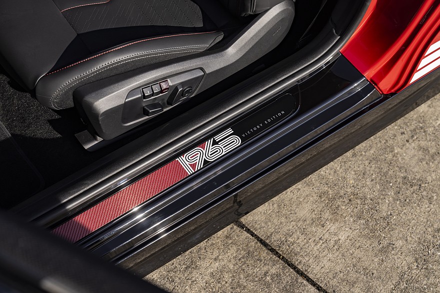 Ещё такой хэтчбек получил накладки на порогах с названием версии и информацию о ралли 1965 года на отдельных овальных наклейках, расположенных в торцах дверей. Интерьер Mini 1965 Victory Edition выполнен в традиционной цветовой палитре JCW. Он получил декор с отсылками к названию спецверсии, в том числе в нижней части рулевого колеса.